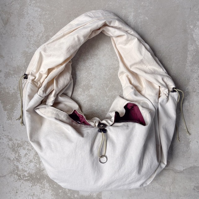 2026 SS 商品番号:LEH-1116 アジア圏の僧侶が身に着ける袈裟がデザインソース。持ち手のパーツを180度捻る事で、独特なドレープが生まれる。左右持ち手の脇にはドローコードとストッパーで更に全体のシルエットを調節可能。ボディー中央箇所には同じくドローコードとLEHアトリエにてオリジナルで作成した25mmレザーボタンがカシメ止めされ、ストッパーで開閉が可能。慎重にバランスを図り、見た目以上の収納力を兼ね備えながら、重量はそれ程に無くストレスフリー。男女問わずにセレクトいただきたいアイテム。 Color: White サイズ: Free 性別: Unisex FABRIC: COTTON 100% LINING: POLYESTER 100% 原産国: JAPAN
