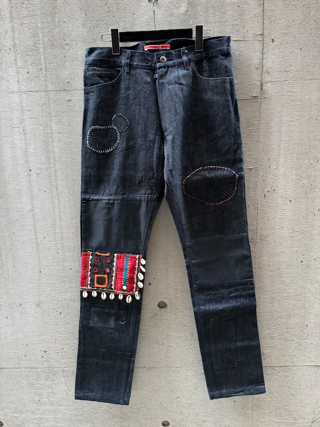 商品番号: LEH- デニム生地に手付でのパッチやミラーワーク生地、異素材生地が組み合わされたライトなクラストパンツ。 バックポケットにはインドvintageのチロリアンテープのライン付き。 Color: Black Denim サイズ: M ウエスト42cd 総丈110cm 性別: Unisex FABRIC: COTTON 100% 原産国: INDIA *こちらの商品はアトリエサンプルとなり、一点もののアイテムとなっております。 また、汚れやダメージがある場合が御座いますのでご容赦下さい。