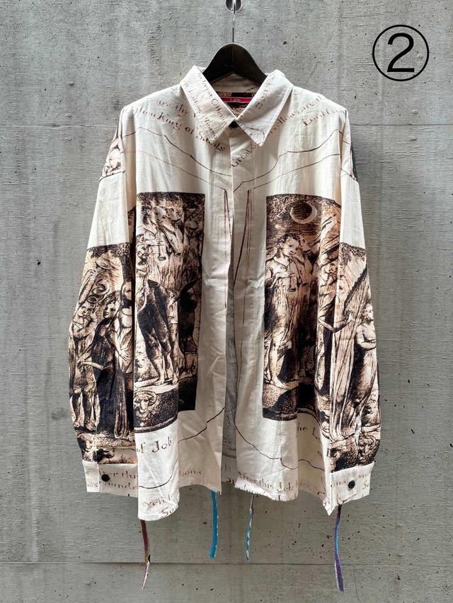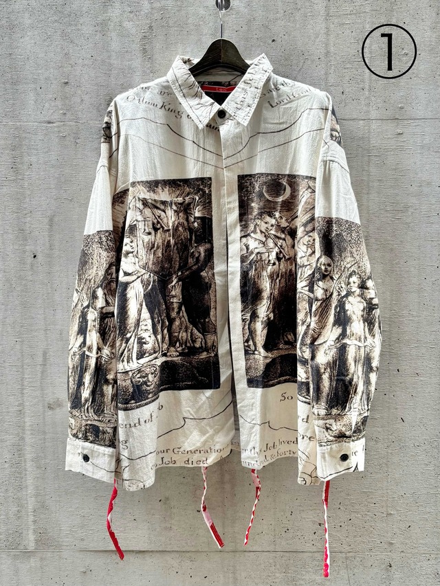 2023 AW 商品番号: LEH-945 腰には左右から共地のベルトが付き、男女ともに着ることを考えたもの。 フロントボタンで留めるのではない為、全体のシルエットに遊びが生まれる。 それぞれの紐の縛る位置を変えれば、更に着こなしの幅が増える。 C/#ホワイトは、イギリスの詩人で画家、ウィリアムブレイクの宗教画をデジタルプリントで生地全体に表現した。 Color: White サイズ: L 性別: Unisex FABRIC: COTTON 100% 原産国: INDIA *こちらの商品は、一点もののアイテムとなっております。 こちらの商品は汚れが御座いますのでご確認下さい。