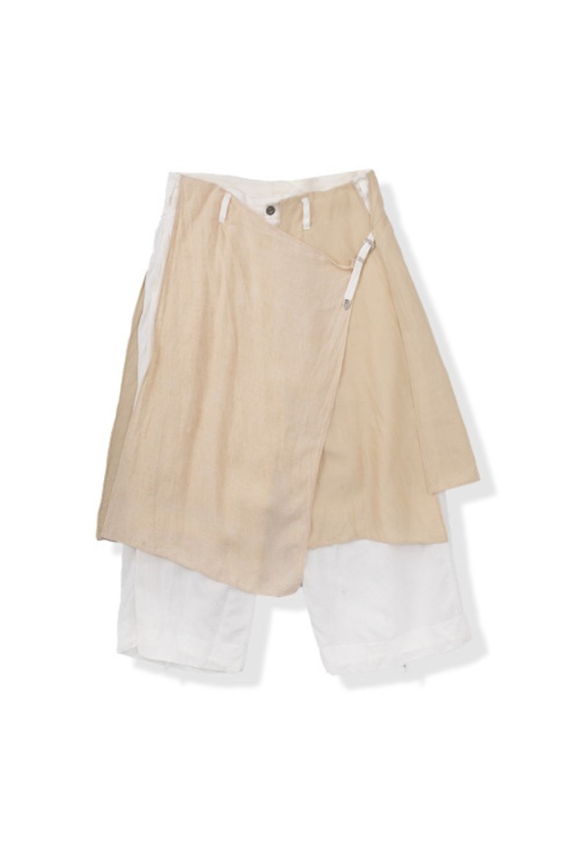 2021 SS 商品番号: LEH-785 千層衣シリーズの8分丈イージーパンツ。前身・後身頃に2種類の別布をベルト部分にだけ縫い込む事で、適度な空気感を演出している。撒いたり縛ったり、様々な雰囲気となるアレンジが可能。ウエストにはドローコードが付いている為、ストレスが無い履き心地の良いパンツ。 Color: Beige Mix サイズ: M 性別: Unisex FABRIC: COTTON LINEN 原産国:JAPAN *こちらの商品はアトリエサンプルとなり、一点もののアイテムとなっております。 また、こちらのアイテムには汚れが御座います。