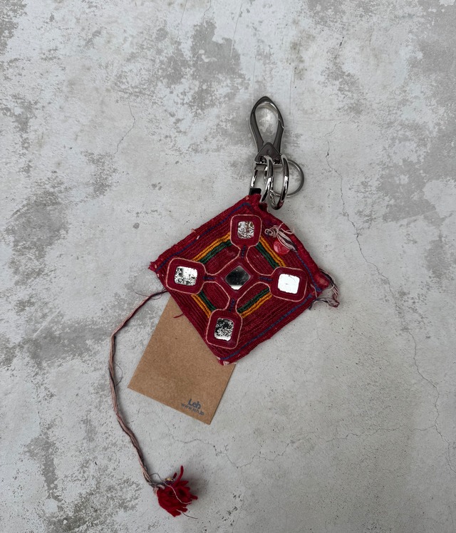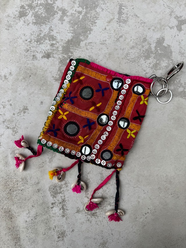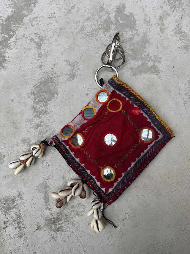 Key Ring MADE IN JAPAN AntiqueCotton100% LEH 定番のキーリング。 使用している手刺し子やミラーワーク、シェルワークのポーチは、インドの西の砂漠に住むジプシー達が、家事の合間に手作業で時間をかけ丁寧に製作したものだけを厳選。魔除けやお守りとしての由来が主にですが、ハレの日の衣装など受け継がれた伝統に敬意を示す、という意味もこめられています。 USA産の金具に取り付ける作業は全てLEHアトリエで行っています。 現在では、このような根気のいる手作業を現地の女性たちも行わなくなってきており、ポーチは時代の移り変わりにより 年々手に入らなくなっている。 いずれこのようなクオリティーのものは無くなっていくだろう。 ※こちらはアンティーク、ヴィンテージのパーツを使用しております。その為、汚れ・ダメージ等ある場合が御座います。ご理解の程お願い致します。