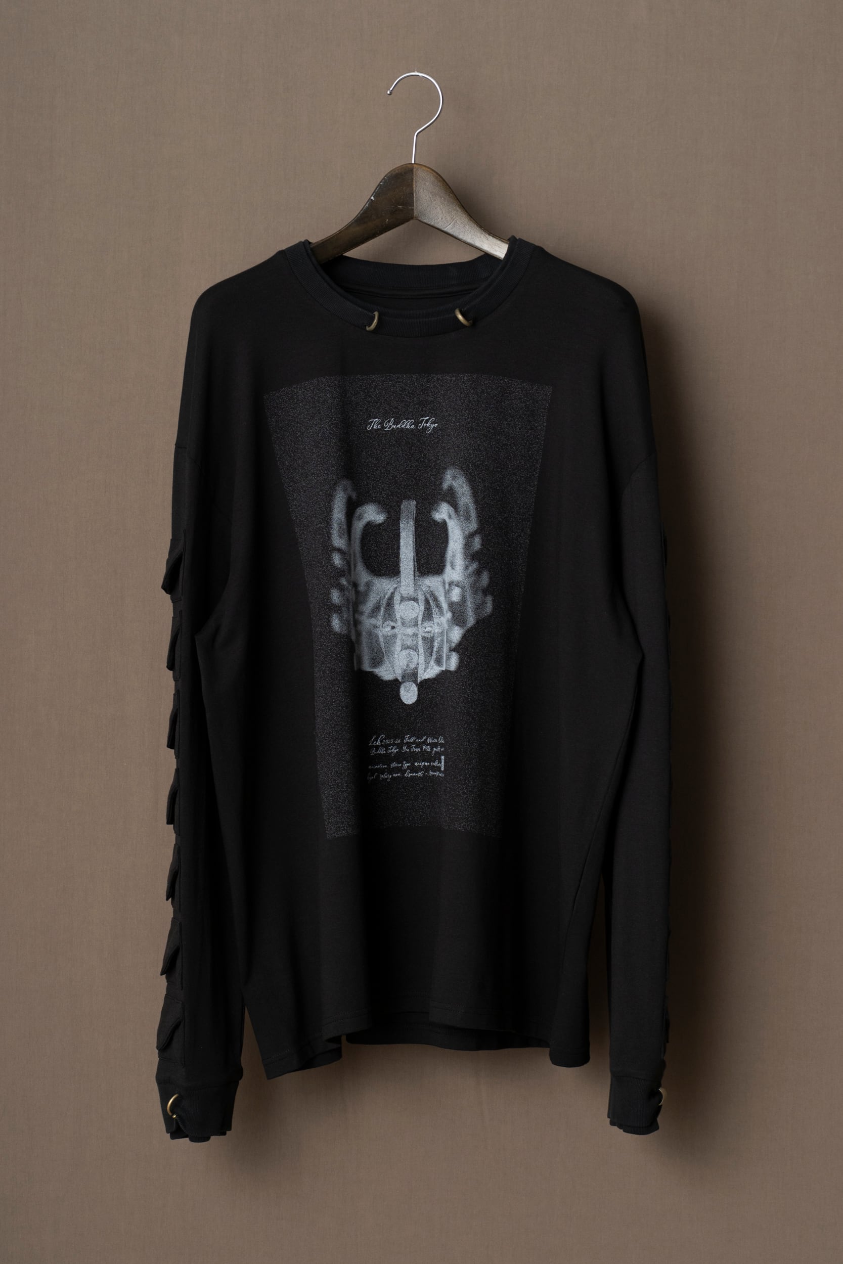 両袖に封筒モチーフのポケットが合計14個付いた長袖カットソー。インドの真鍮やシルバー、鉄により作られた民族のリングが5か所付き、また、リブ部分は非常に珍しい二重となっているため、リングが肌に直接当たらない優しい設計となっている。
