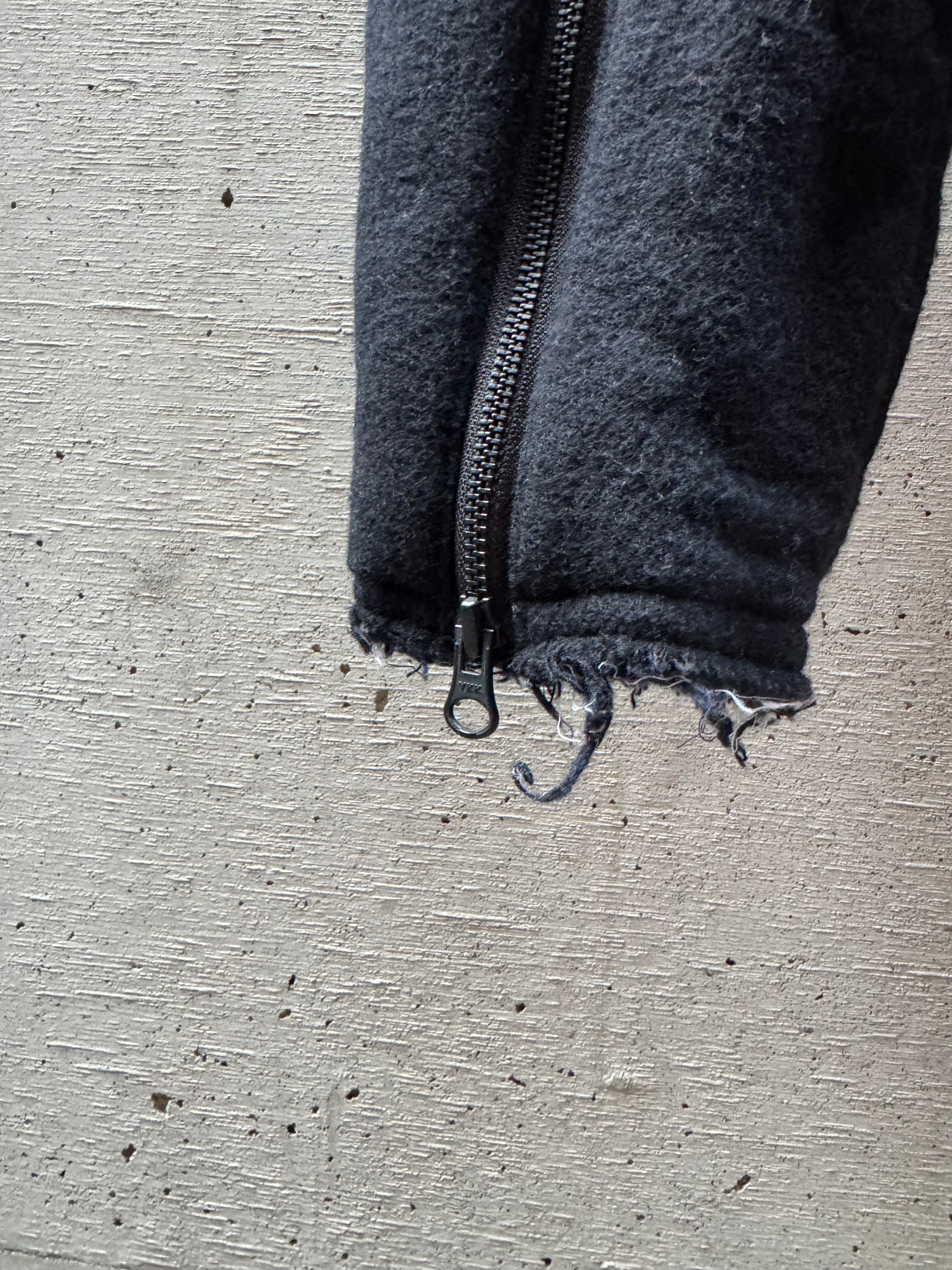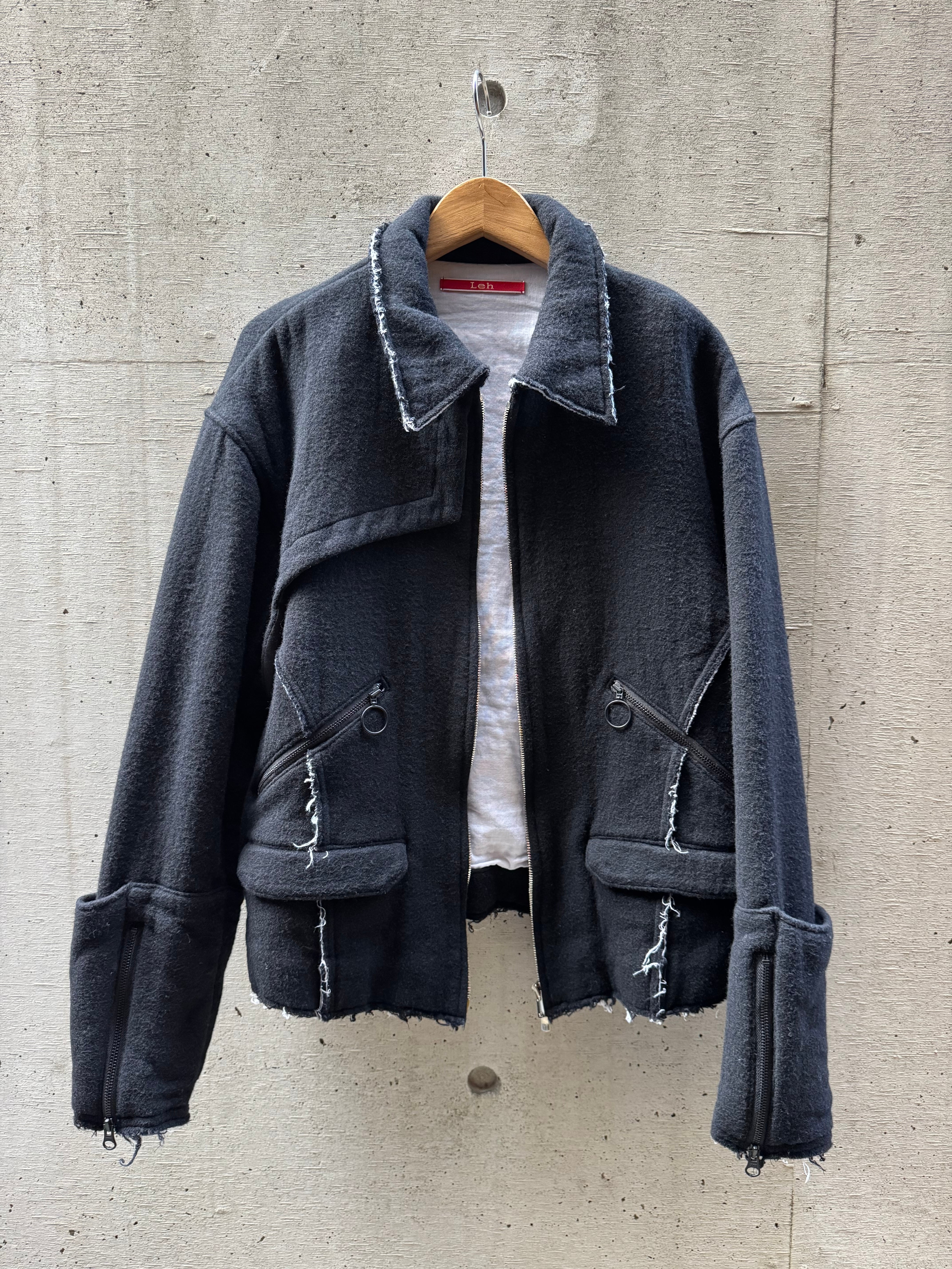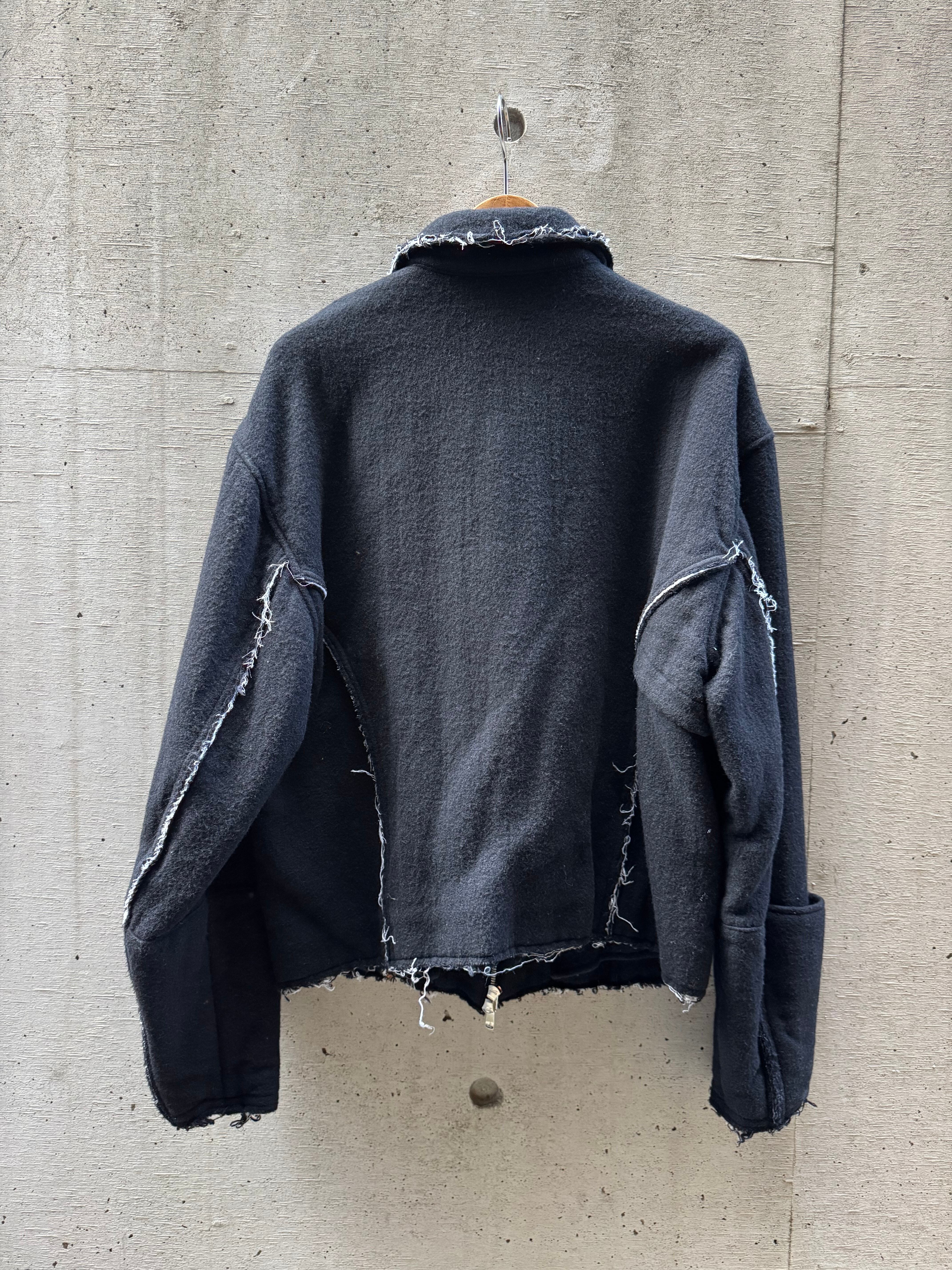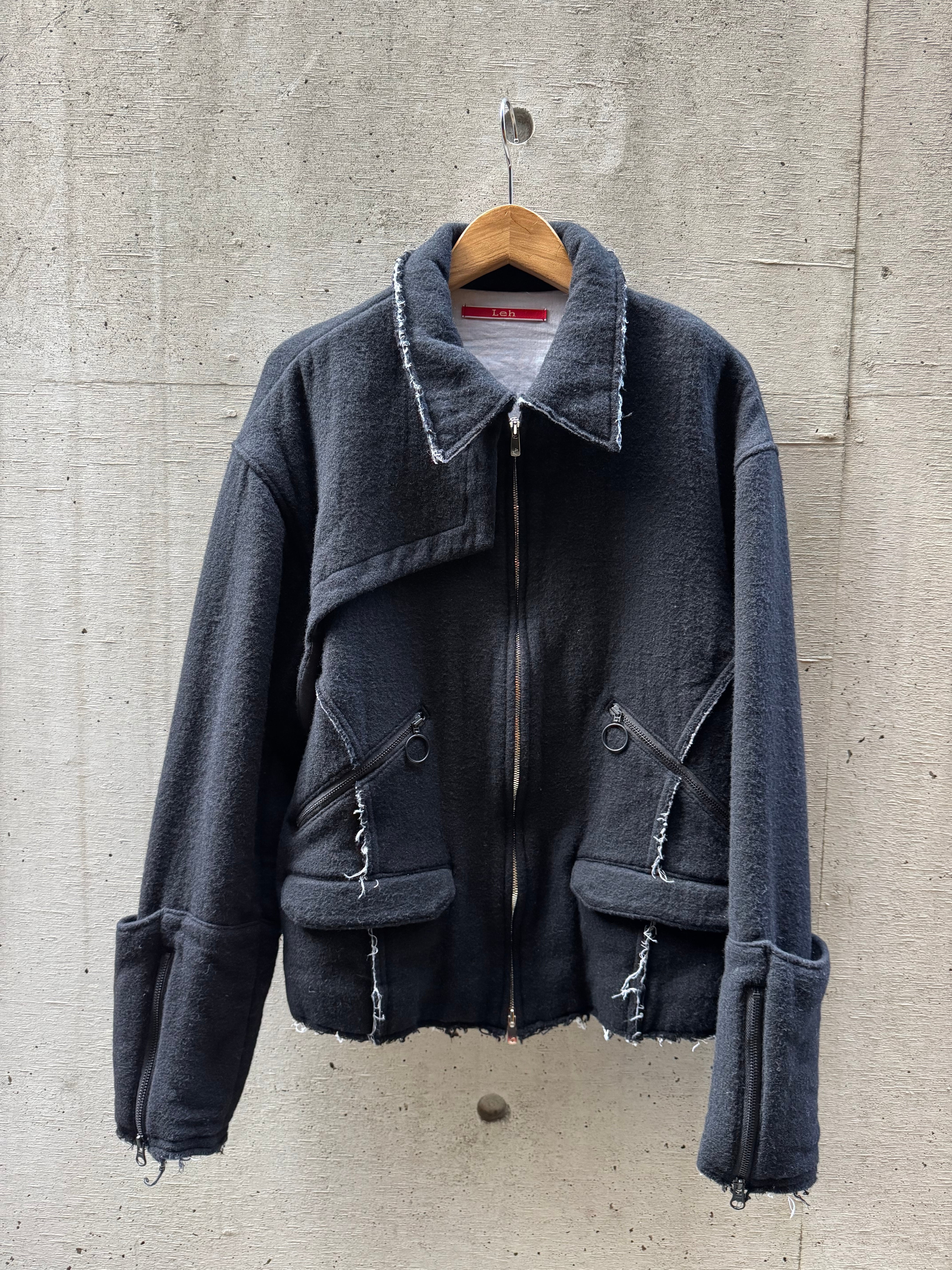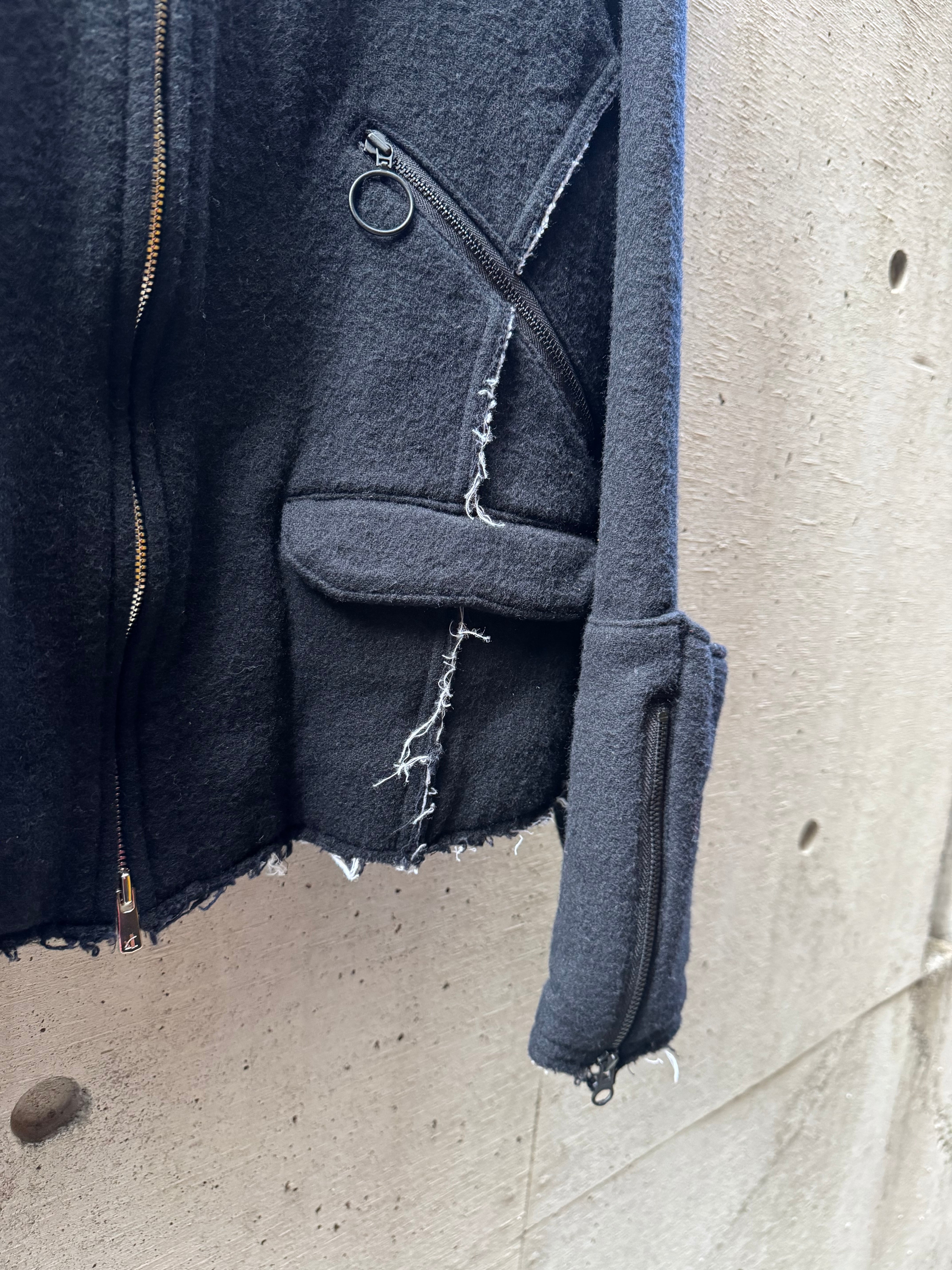 柔らかなウールの表地に、裏地はダブルガーゼ素材を使用した着心地の良いブルゾン。各所断ち切りで、独特なニュアンスの右身頃のふらし仕様や袖口のデザインがポイントに。