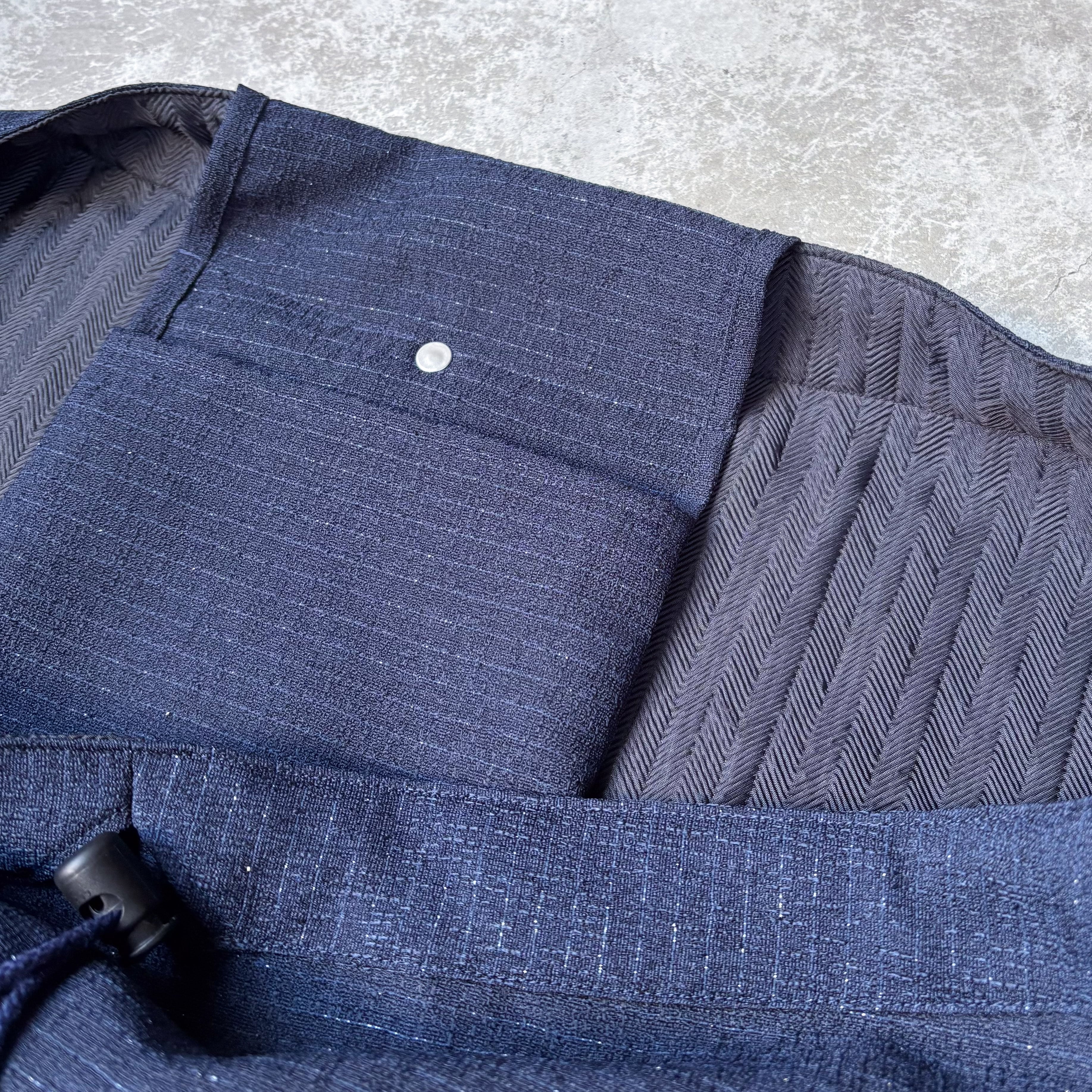 アジア圏の僧侶が身に着ける袈裟がデザインソース。持ち手のパーツを180度捻る事で、独特なドレープが生まれる。左右持ち手の脇にはドローコードとストッパーで更に全体のシルエットを調節可能。ボディー中央箇所には同じくドローコードとLEHアトリエにてオリジナルで作成した25mmレザーボタンがカシメ止めされ、ストッパーで開閉が可能。慎重にバランスを図り、見た目以上の収納力を兼ね備えながら、重量はそれ程に無くストレスフリー。男女問わずにセレクトいただきたいアイテム。