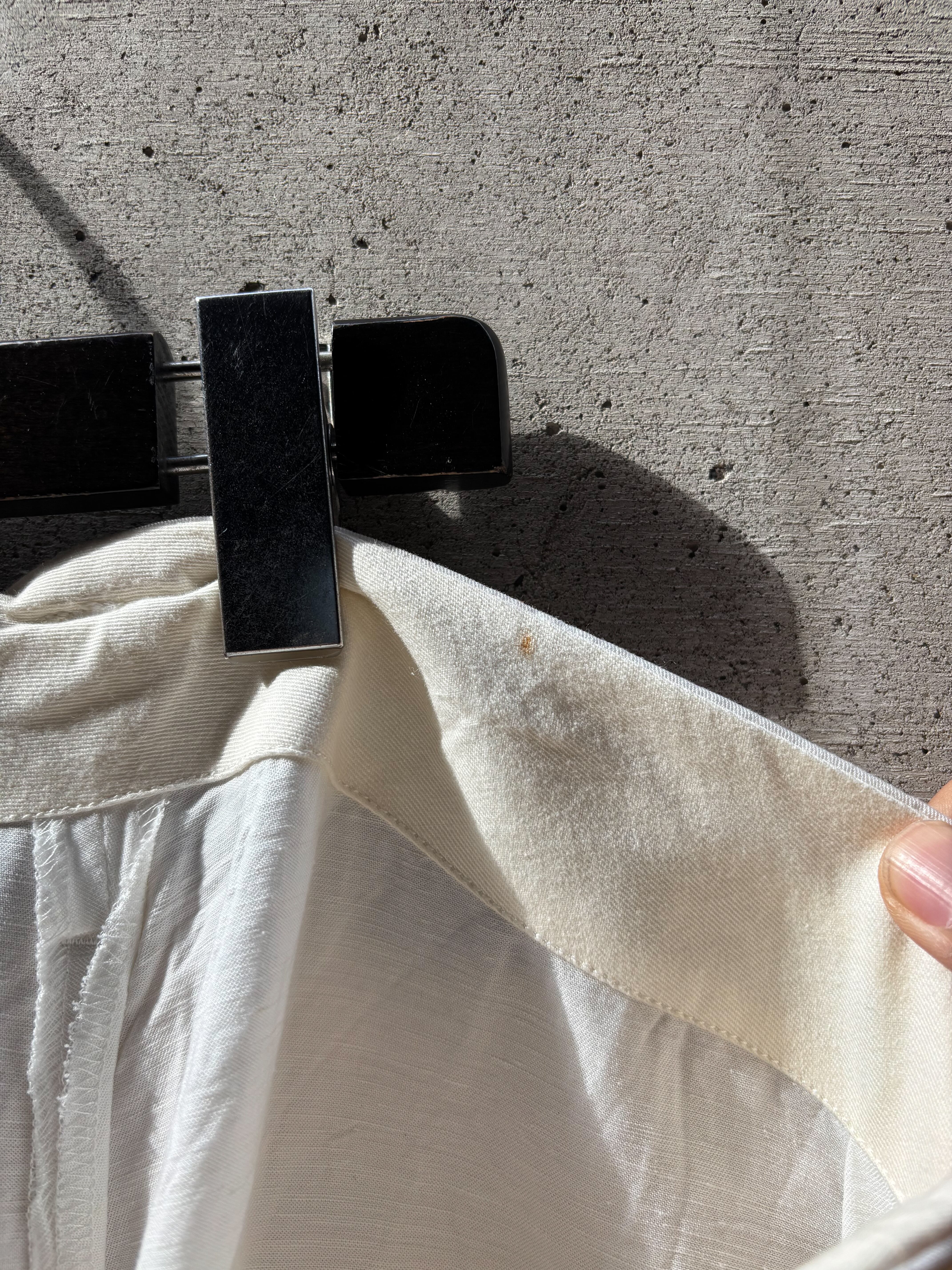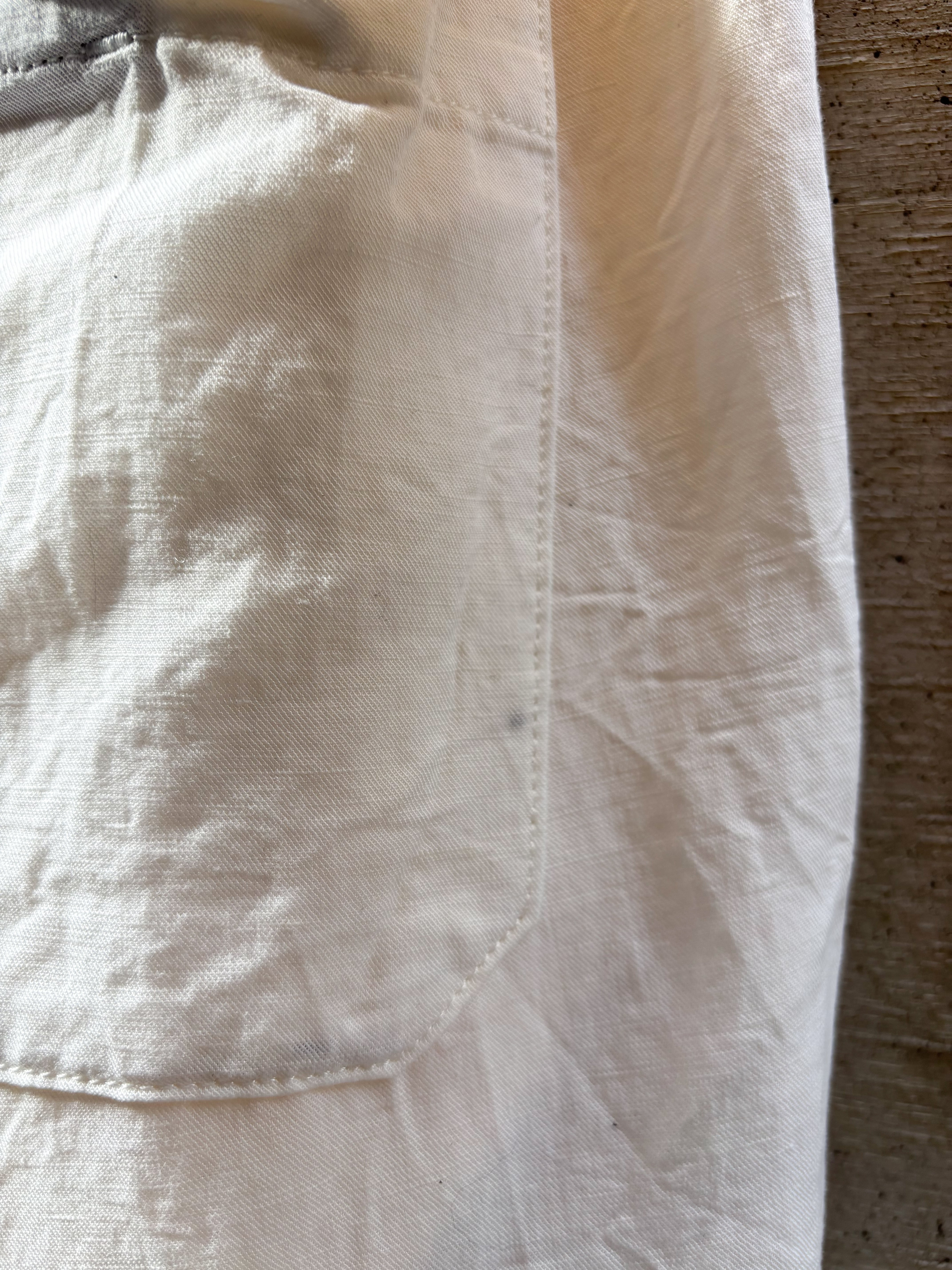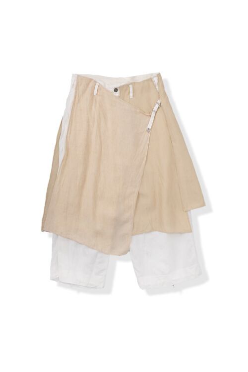 千層衣シリーズの8分丈イージーパンツ。前身・後身頃に2種類の別布をベルト部分にだけ縫い込む事で、適度な空気感を演出している。撒いたり縛ったり、様々な雰囲気となるアレンジが可能。ウエストにはドローコードが付いている為、ストレスが無い履き心地の良いパンツ。