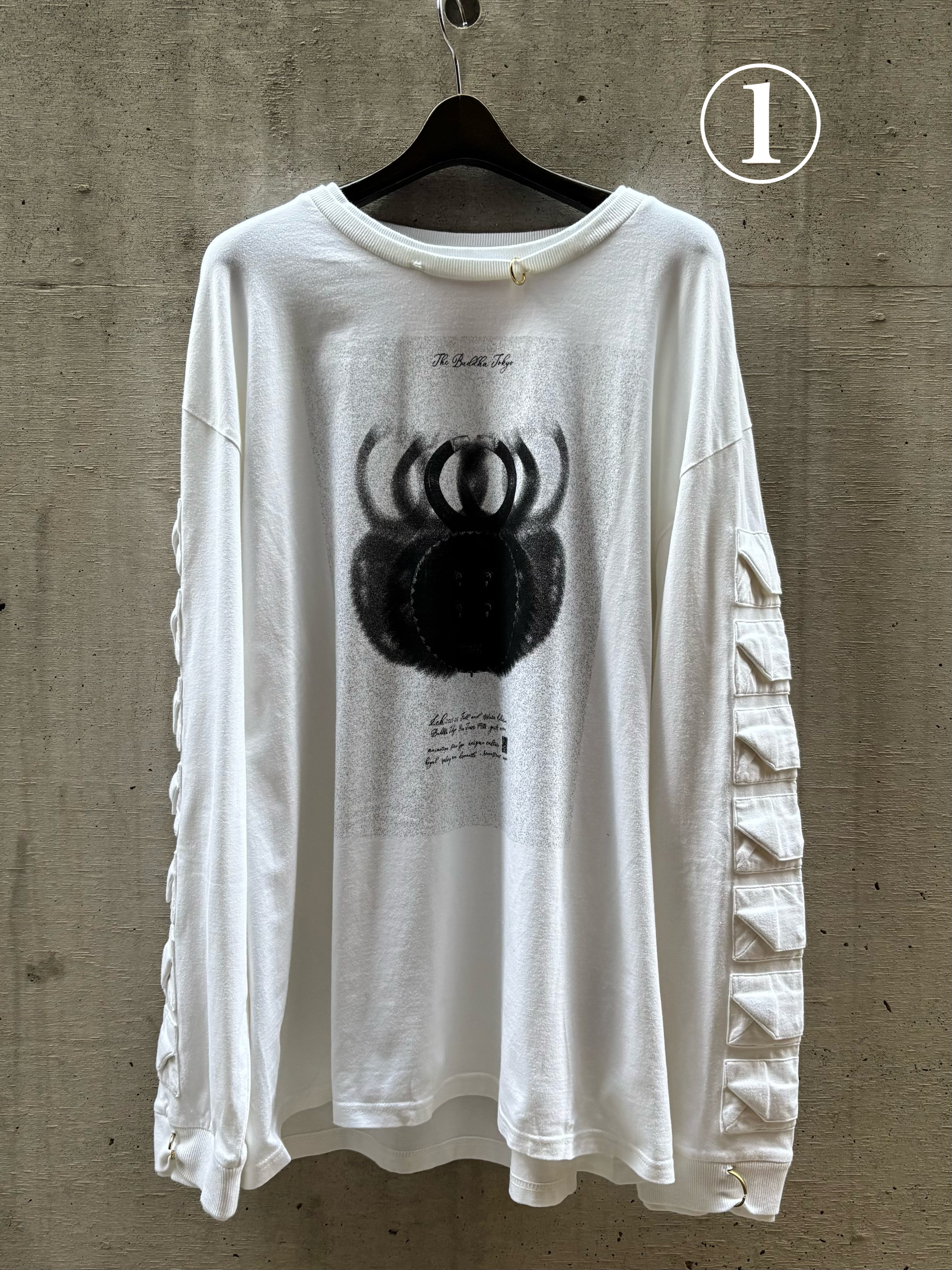 両袖に封筒モチーフのポケットが合計14個付いた長袖カットソー。インドの真鍮やシルバー、鉄により作られた民族のリングが5か所付き、また、リブ部分は非常に珍しい二重となっているため、リングが肌に直接当たらない優しい設計となっている。