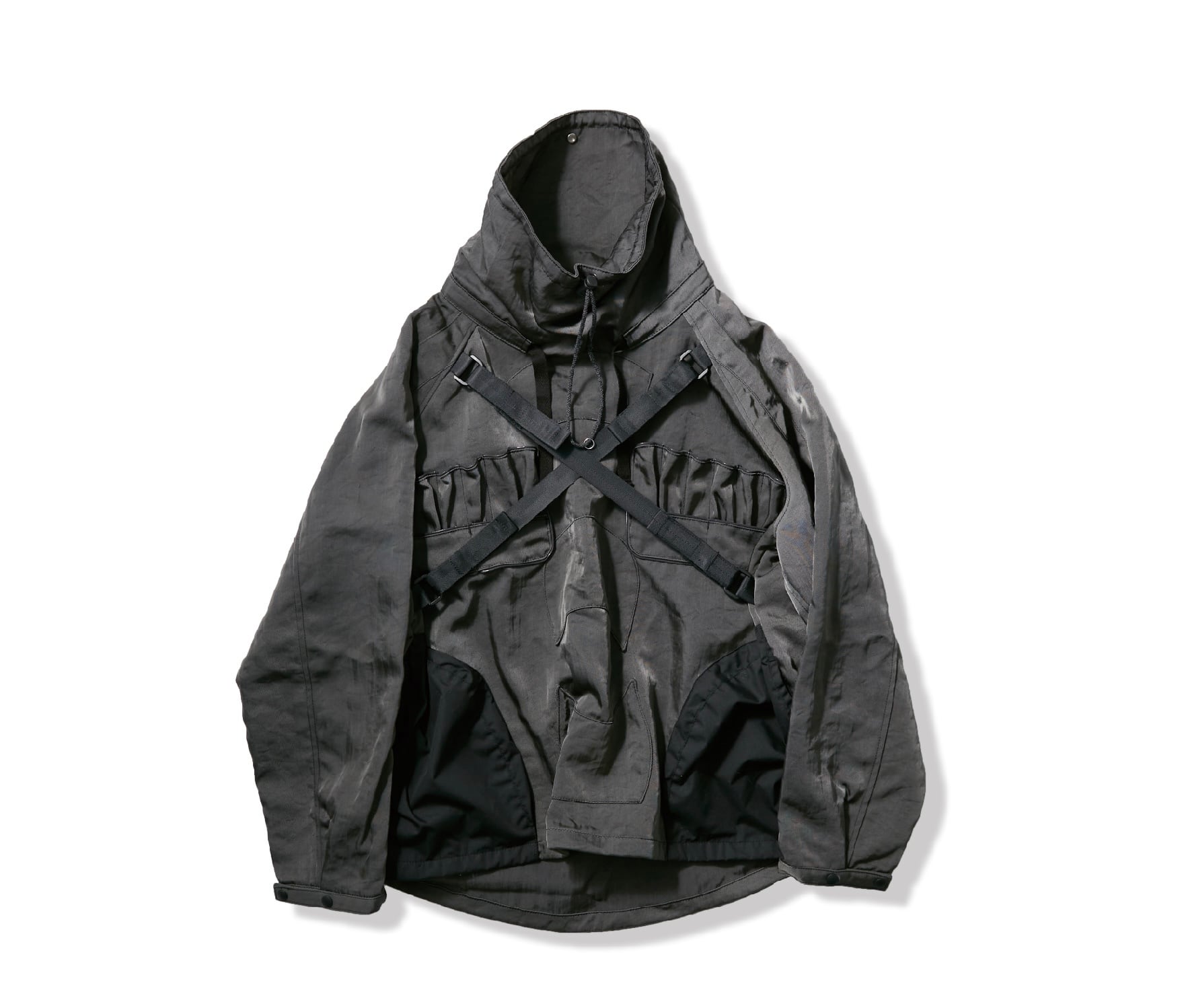 ヴィンテージ感のあるナイロン生地を使用、撥水加工。身幅を程よく出し、胸もとのテープでクロス状に調整が出来る。