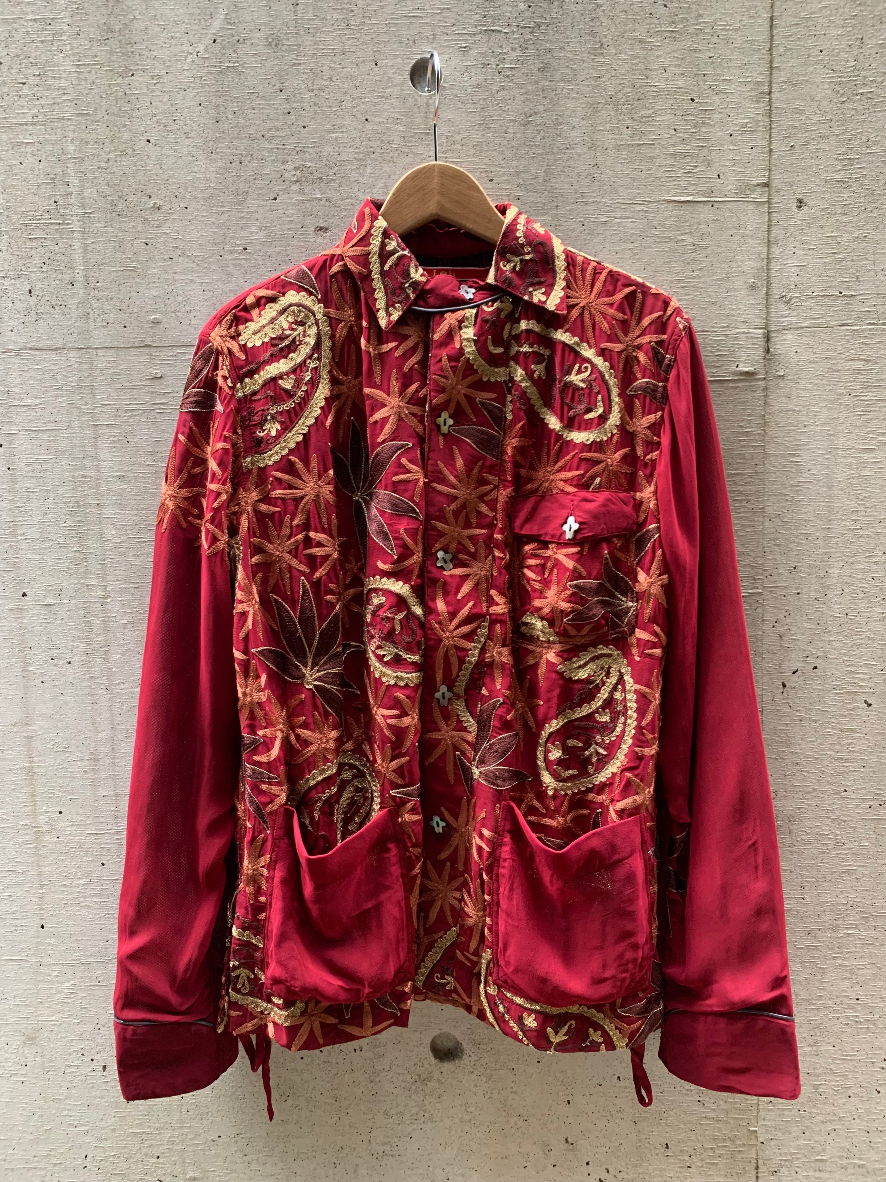 それらの布に後染を施し、サスティナブルに蘇らせた。数シーズン前に作成したCover Allと同型で、完成されたシルエットに全部で5ヶ所ポケットが付く。襟はバンド仕様。シリコン製パイピング。裏地には通気性とストレッチ性の高いポリエステル生地を配置。季節に関係無く、年間通して着る事が出来るだろう。人型のヴィンテージシェルボタンが付いている。